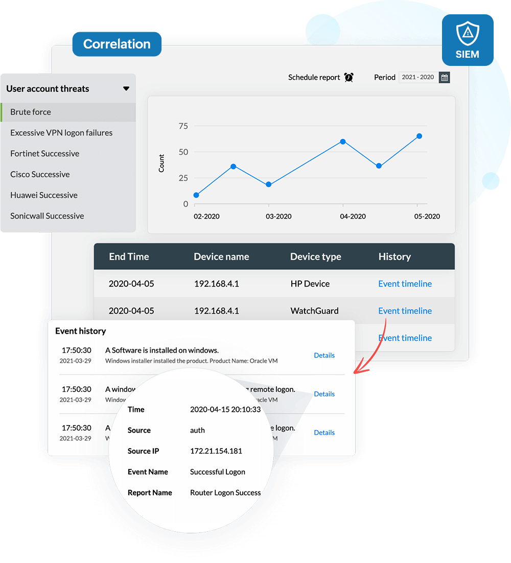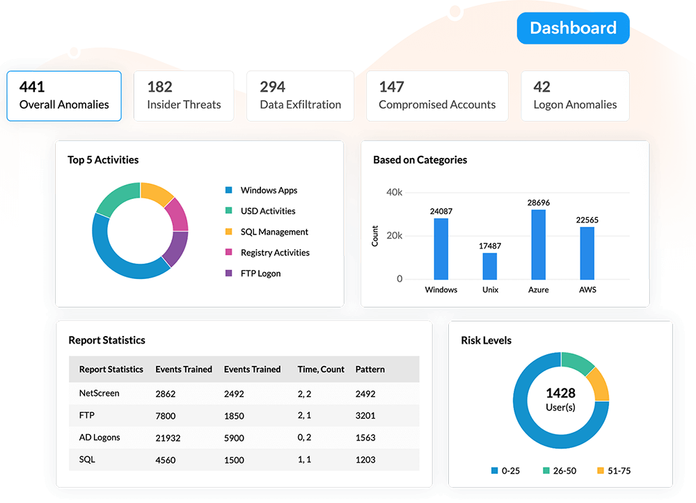 Leverage machine learning to spot malicious insiders It is more difficult to spot insider attacks as they are carried out with legitimate access. Log360's UEBA component ingests log data of the users over a period of time and profiles all of their behaviors. When a chain of suspicious behavior, such as odd logon times, unusual access to sensitive data, or multiple file downloads is detected, the user's risk score for insider threat increases and the security team is alerted. Log360 also provides detailed event timelines for further investigation.